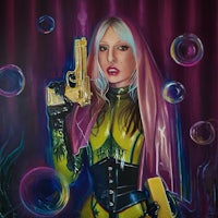 ‘No Violence With My Bubble Gun’ 2025; 90x85cm; antique oil-based paint on canvas)