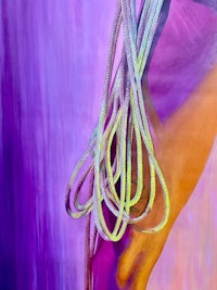 ‚Pleasure Priestess‘ (2024; 80x120cm; acrylics, solid silver, rhodanized stainless steel and mother of pearl on canvas)